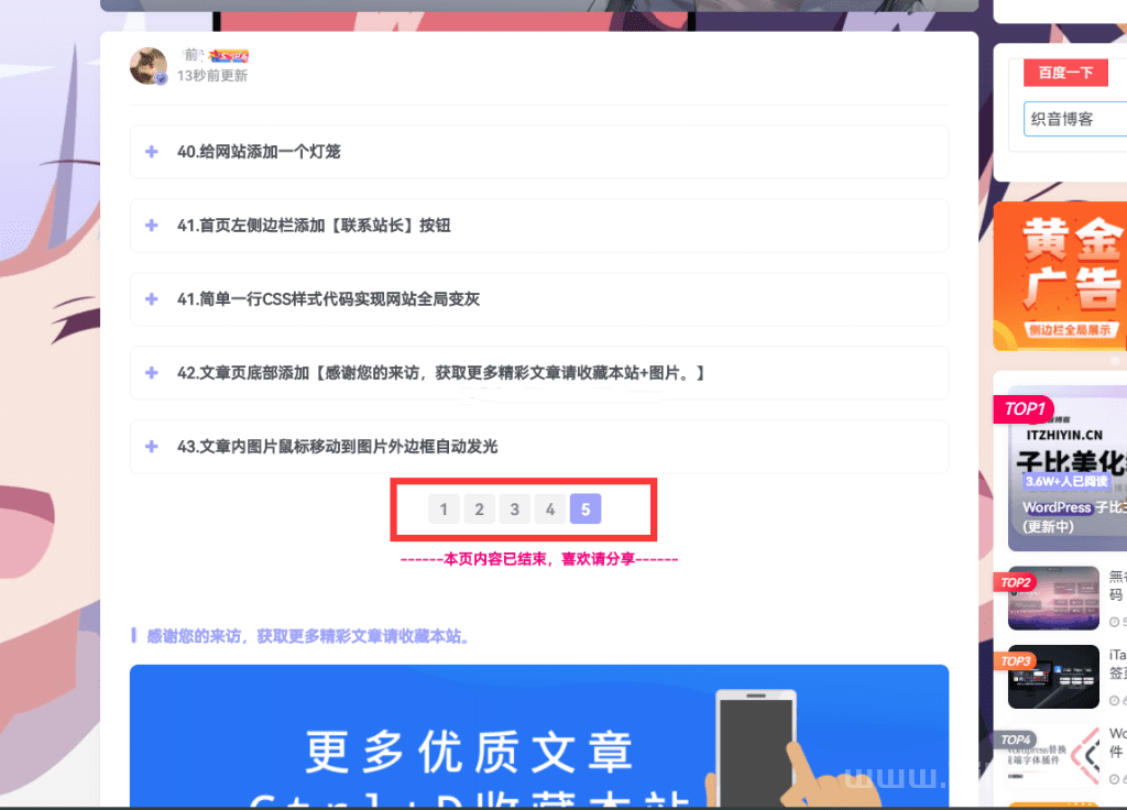 Zibll主题美化 长文章分页按钮美化优知新2年前更新关注私信11670 wordpress自带的分页按钮是比较丑的很突兀,经过社长一段下面的 CSS 代码优化之后会变得更加美观,经过美化后非常符合子比的风格,很多网站也已经再用了,喜欢的收藏吧。 效果图: 使用教程: 子比主题添加路径:网站管理后台-–》子比主题设置—》自定义代码—》自定义 CSS 样式,把下面的 css 代码复制粘贴到里面即可。 自定义 CSS 代码 /*文章分页按钮美化*/.post-page-numbers{padding: 4px 10px;text-align:center;display: inline; }.post-nav-links{background:0;margin-left: -50px;} 温馨提示:本文最后更新于2023-07-29 17:36:28,某些文章具有时效性,若有错误或已失效,请私信客服或联系知新社长。 © 版权声明文章版权归作者所有,未经允许请勿转载。 二月 6 知岛上的今时往日 2024:在php中加css_php学习之css入门 (0)2024:网络安全方向:10分钟2700w请求的攻击我是如何处理的 (0)2024:02月06日,星期二,每天60秒读懂全世界! (0) THE END子比主题网站/配置/代码# 美化 喜欢就支持一下吧点赞0赞赏 分享QQ空间微博QQ好友海报分享复制链接收藏2